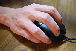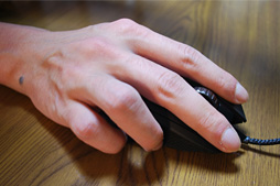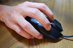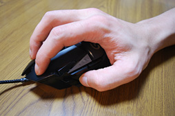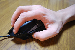 大きめで重量感のあるマウスは一般に,「かぶせ持ち」との相性がいいのだが,実際に握ってみると,G502の場合は,前段で述べた「微妙に歪んだ右側面」のために小指の配置場所を安定させづらく,意外と適していない。