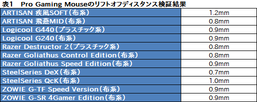 その結果が表1で,優秀の一言。最も長いケースでも1.2mmで,平均値は0.89mm。4Gamerが基準とする最大2mmを大きく下回っており,マウスを振り回すときの心配は無用と断言してよさそうである。