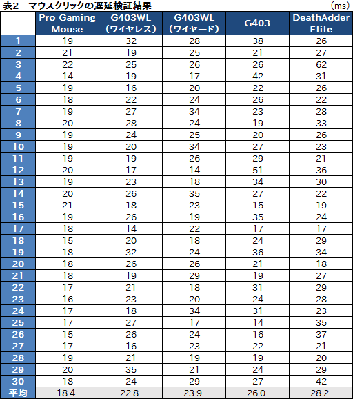 その結果が表2で,はっきり言って,Pro Gaming Mouseのボタンクリック時における応答速度は相当に速い。最初は計測ミスかと思い,追加で4回再計測したが,測定結果はほぼ同一だったので,これはとてつもないと言わざるを得ないだろう。これまでテストしてきたマウスの中では圧倒的に最速だ。