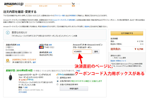 クーポンコードは,Pro Gaming MouseもしくはPro Mechanical Gaming KeyboardをAmazon.co.jp内でカートに入れた後,レジに進んで,決済直前の「注文内容を確認・変更する」ページで入力することになる。下に示したボックスへ入力したら,[適用]ボタンをクリックすると,決済時に割引きが確定となる仕掛けだ。