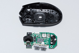 ということで,いつものように底面部のソールなどの下に隠れているネジを外すと,上面カバーは簡単に取り外せる。この時点で分かるが,基板の枚数は大小2枚。テンションシステムが「G302 Daedalus Prime MOBA Gaming Mouse」やG303と似たタイプなのも確認できた。