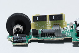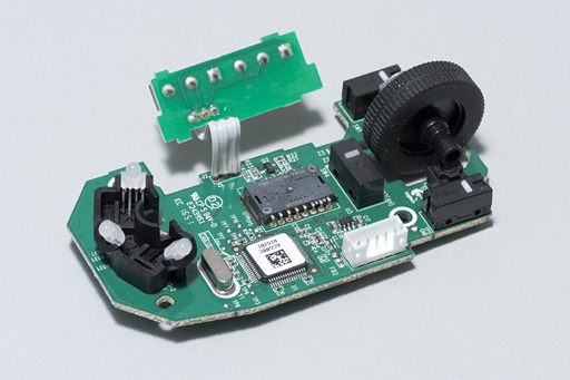 というわけで,下に示したのがメイン基板での写真である。中央のセンサーはもちろんPMW3366(※刻印はPMW3366DM)だった。スクロールホイール手前のボタン用スイッチには「Kailh」の刻印があるので,Kaihua Electronics製ということになる。