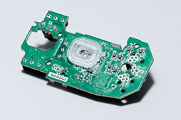 ![]() 底面カバー部から基板を取り出したところ。軽量化のためか,筐体と比べるとかなり小さい。また,サイドボタン用スイッチの載ったサブ基板は着脱不可だった |