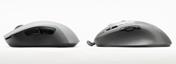 一方,デザイン上の細かな点,たとえば左右メインボタンには若干の凹みが入っていて,指を配置するときのガイドになるとか,スクロールホイールはラバー素材で覆ってあり,1周24ノッチであるとか,ホイールの手前には工場出荷時設定だとDPI設定の順繰り変更が割り当てられたボタンが1つあるとか,親指の配置場所である右側面に,いかにもIE3.0クローン的な凹みがあるといったあたりで,G603はG403WL&G703とそっくりだ。基本的には完成度の高いIE3.0クローンと紹介してしまって構わないだろう。