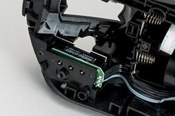 上の写真を一見して分かるのは,左右メインボタンのスイッチが筐体側にあることと,スクロールホイールおよびホイール手前のボタン用スイッチが,メイン基板とは別の基板に載っていることだろう。またこの時点で,Logitech G/Logicool Gが「SPECULAR OPTIC SYSTEM」(スペキュラオプティックシステム)と呼ぶ光学機構のレンズが特殊であることも確認できる。