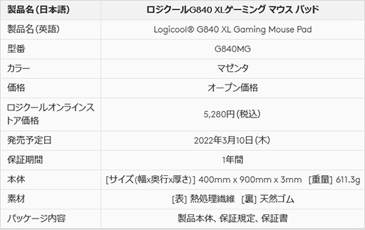 新色マゼンタは男女共に選択しやすいカラーで、新たに追加されるマウスパッドG840マゼンタと併せても良し、従来のG840ブラックと併せても良いでしょう。