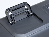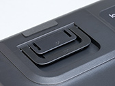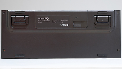 G915 X LIGHTSPEED TKLの底面を見ていこう。滑り止めのゴム脚は4つあるのだが,スタンドを立てた場合,スタンド先端にあるゴムの面積が狭いためか,意外とキーボードが滑る。もちろん,通常の打鍵時に滑ることはないが,激しく操作する癖がある場合は,微妙に位置がずれる可能性があるため,別途ゴム脚の追加を検討するといいだろう。おすすめの追加ポイントは裏面中央やや下付近だ。