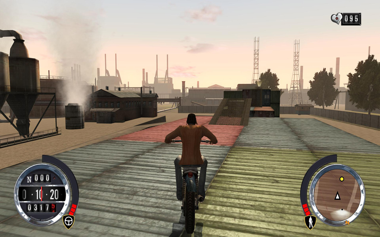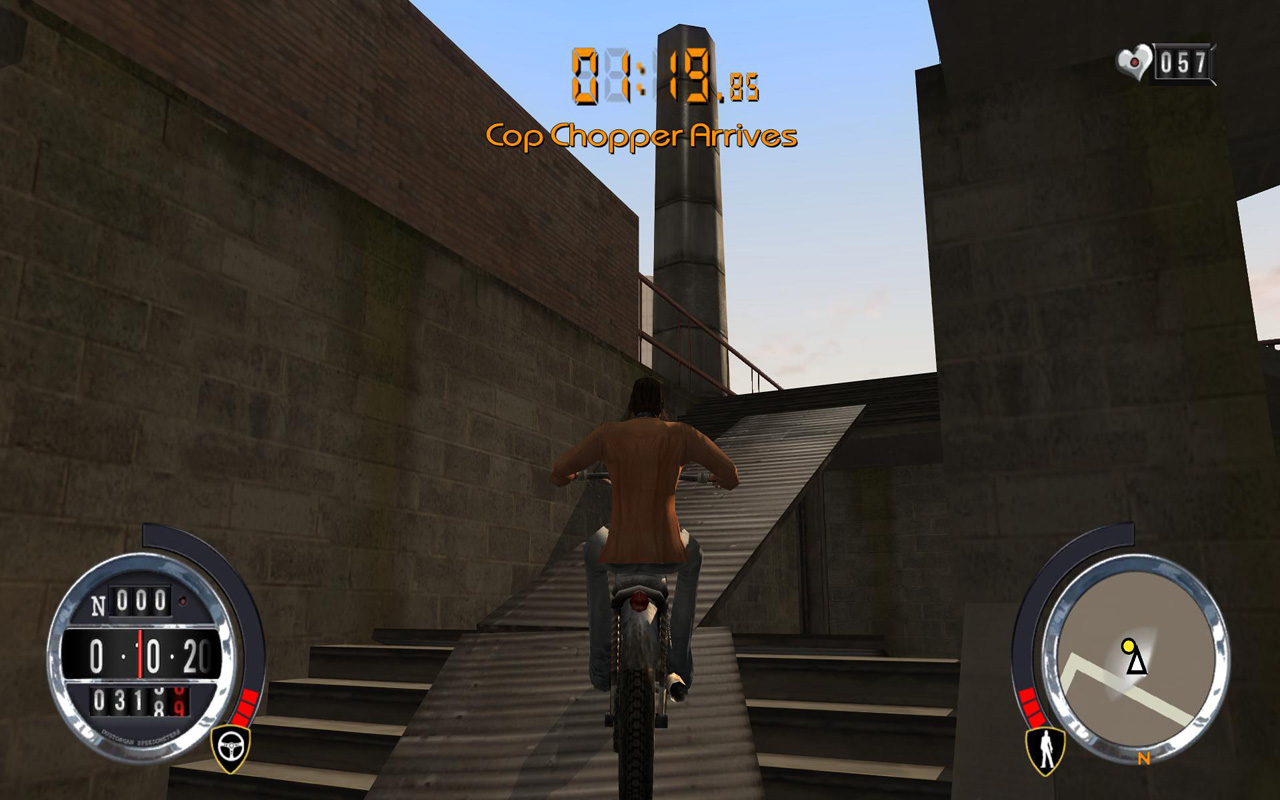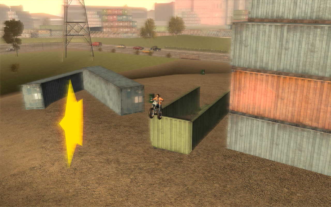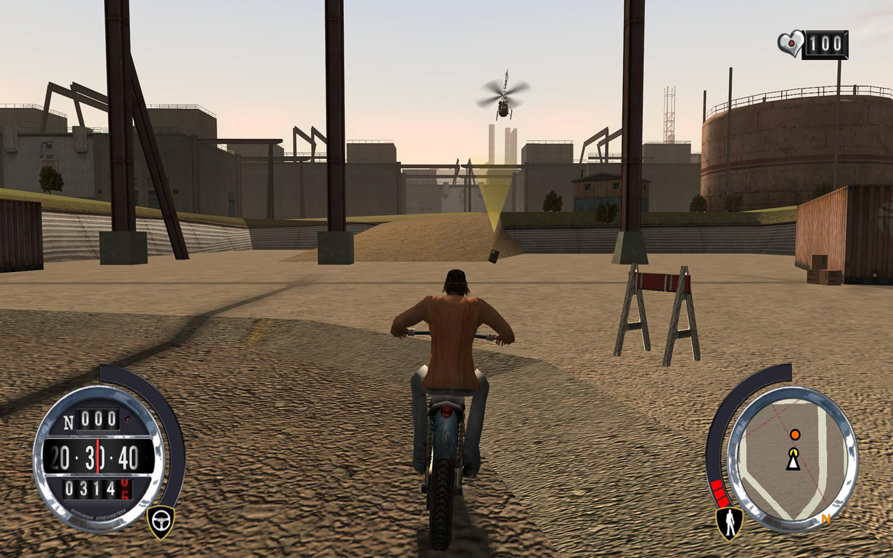 スリンクから,荷物回収の仕事で呼び出しがあった。しかし情報が漏れて,回収場所には警察が待ち伏せているらしい。たぶん荷物の中身はお菓子なんかじゃなさそうだ。ヘリから次々に荷物を落とすから,追いかけて拾い集めろとのこと。どうせ全部集めるんだし,一か所に全部落としてもらっても全然構わないんだが,相変わらずスリンクの考えることは要領が悪い。「ダートもあるからバイクがいいぞ」とバイクを用意してくれたようだ。こういうところは要領が良い。