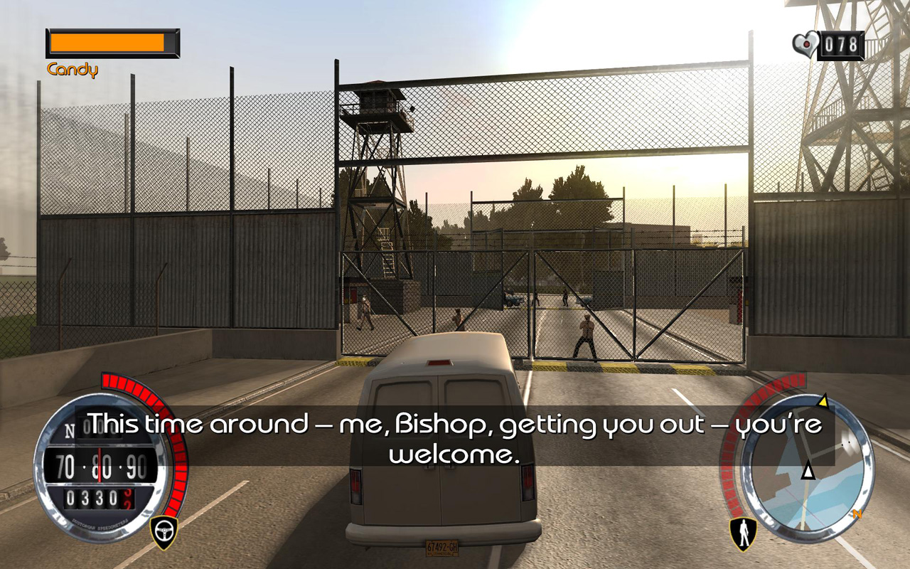 少々味気ない依頼が続いたが,ここで少し骨のある依頼が入ってきた。刑務所の警備員から得た情報をもとに(前回参照),キャンディーの脱獄作戦を行うとのこと。これで以前に奪った護送車が役に立つというわけだ。作戦自体は護送車で刑務所に行き,なんとかして刑務所の建物内に侵入。そしてキャンディーを見つけて隠れ家まで連れてくるというもの。こんな無謀な作戦を誰が考えたんだ?