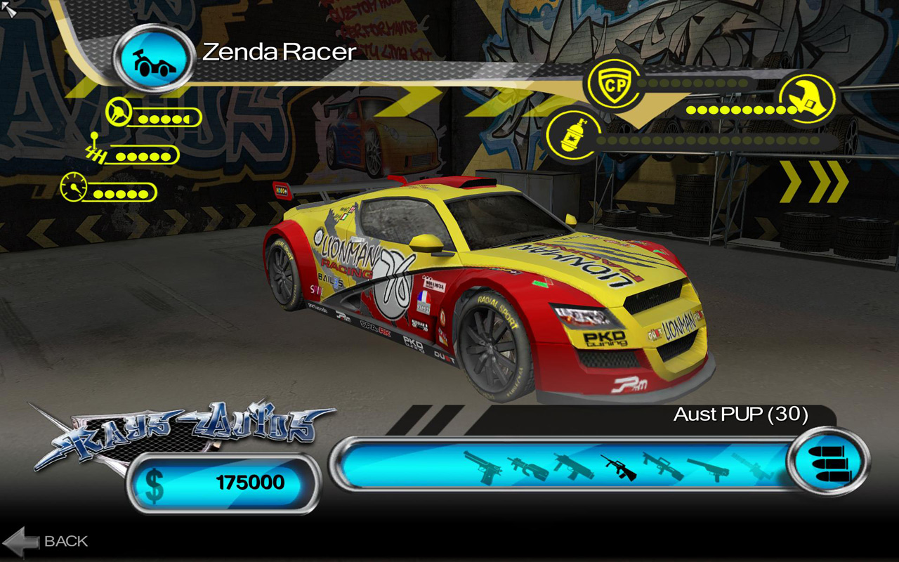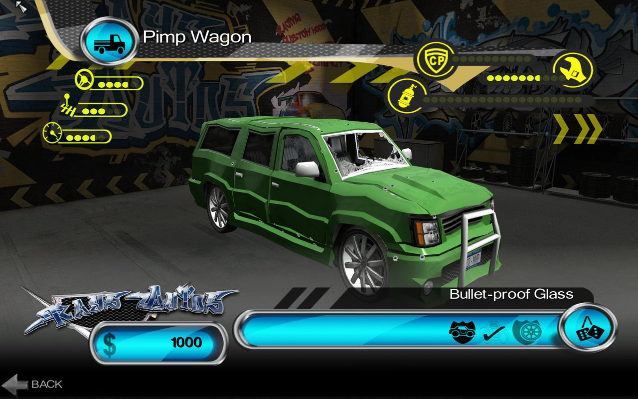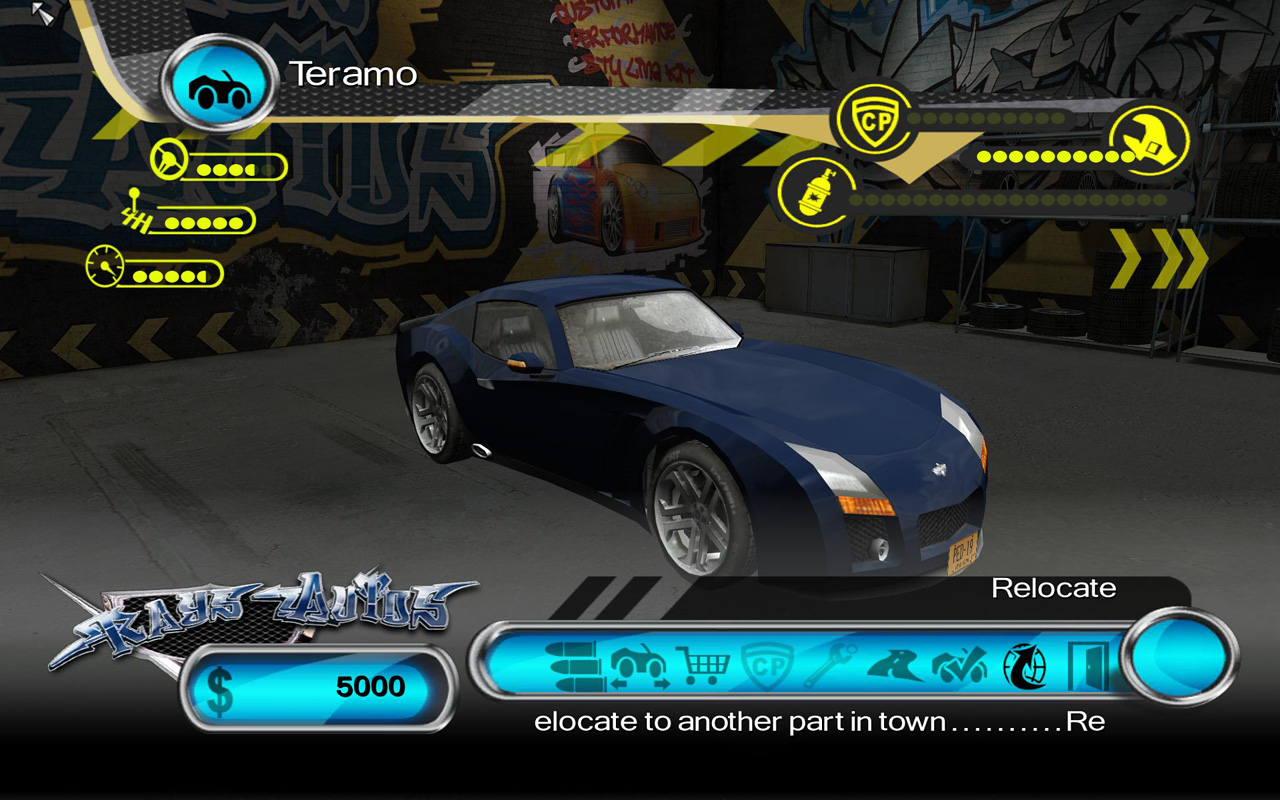 車の手配度をゼロにしたり,修理したり,パーツを購入して車をアップグレード(ボディワーク,パフォーマンス,アクセサリ,スプレー塗装)したり,別地域の整備工場へのワープしたりといったメニューが用意されている。エンジン(ステージI〜III),ニトロ注入キットを車に付ければ鬼のように速くなるし,防弾タイヤ,防弾ガラスを取り付ければ撃たれても少し痛くなくなる。弾薬の購入もここでできる