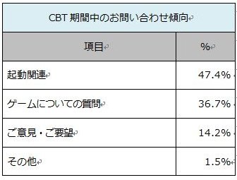プレイできる環境にあった全体の16.6%、2,000名程度が、ダウンロードしたもののプレイできていない。主原因はプレイ時間の確保ができなかったと思われるが、他の原因として、PCスペック不足、プレイ不可能なOS (主にWindows XP機)からのDL、起動中のプログラムとのバッティング、ゲームガードエラー等、ダウンロードおよびインストールから起動までのプロセスで発生した現象によりプレイしなかった、もしくはできなかったと考えられる。上記の仮説を裏付けるように、CBT期間中にサポートに寄せられたお問い合わせのうち、ダウンロードからインストール、起動、パッチ適用時についてが、全体の47.4%を占めている。