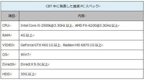 上記は2013年に韓国で行ったCBT時に公表した推奨PCスペックであり、日本でのCBT時もそのまま公開したが、最適化が進み改善が加わった今回のCBTバージョンを様々な環境でテストしたところ、より幅広いスペックのPCに対応していることが確認された。現時点では公開した推奨PCスペックを変更する予定はないが、高スペックPCでは当時に比べスムーズなプレイが可能であり、当時は起動しなかった低スペックPCでのプレイも正常に可能であることが確認できている。