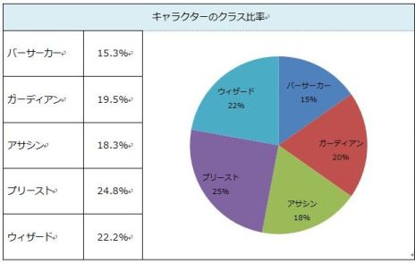 「プリースト」が一番多く、全体キャラクターの24.8%を占めた。続いては、「ウィザード」の22.2%、「ガーディアン」の19.5%という結果になった。最小比率の「バーサーカー」も15.3%を占めており、平均的に全クラスが体験されたことがわかる。