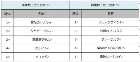 捕獲数上位ランキングでは、捕獲スキルを覚えた直後に出現するため、多くのプレイヤーが捕獲を試したであろう「白毛のトナカイ」「シャドーウルフ」が上位1・2位を占めているが、3〜5位には、クエストには関係ない地域に生息する空中型フェロー「蒼魔竜クテル」「アルイド」「アリアド」が入っており、空高く世界中を飛び回りたいというプレイヤーの欲求が数字としても表れた。これらの空中フェローはCBT時のプレイヤーレベルでは捕獲成功率が低いため、極少数のプレイヤーが獲得すると予測していたが、想定を大きく上回る数が捕獲されており、改めてプレイヤーのフェローコンテンツおよび自由な空中冒険に対する期待を感じることができた。また、捕獲数下位ランキングをみると「ブラックウィンド」「独眼のフンババ」といった精鋭フェローが1・2位になっている。この2種を捕獲するには特殊なアイテムの作成が必要となるため、CBT期間中に捕獲条件を満たすのが難しかったと考えられる。