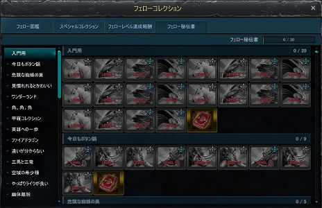 「フェロー秘伝書」が追加された。こちらは,各地域に生息するフェローを捕獲して指定されたレベルまで育成することで,該当のフェローと引き換えに秘伝書に登録できるシステムだ。全てのフェローアイコンを点灯させると,報酬して様々な報酬が得られる。