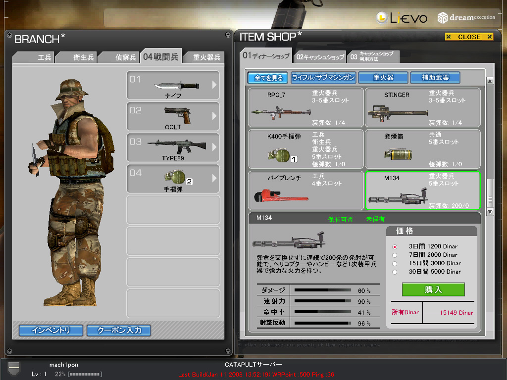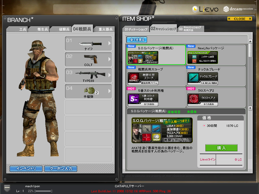 という感じで,武器がレンタルであるところ,アイテムがディナーとLievoコインの二本立てであるところがWarRockの特徴といえるだろう。