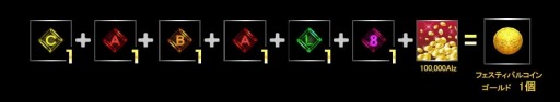 期間中、モンスターを倒すと一定確率で「C」「A」「B」「L」「8」の5つの文字アイテムがドロップされます。組み合わせて『CABAL8』の文字を作りましょう!集めた文字アイテムと手数料をNPC「ユール」に渡すと、便利なアイテムがもれなく手に入る「フェスティバルコイン-ゴールド」と交換できます。