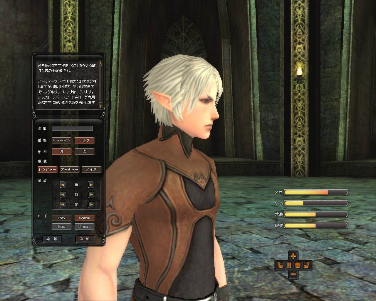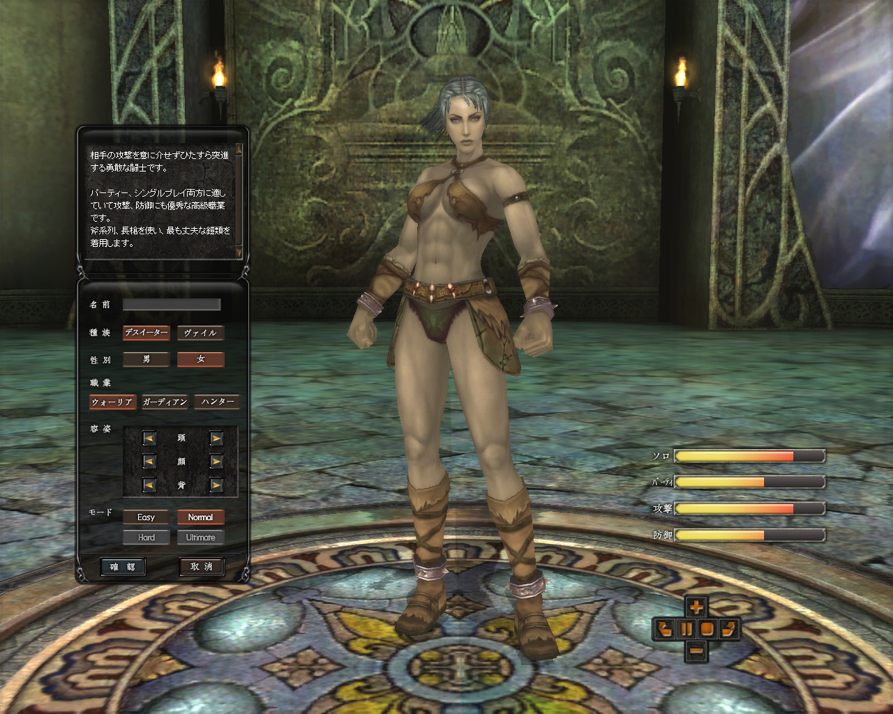 キャラクター作成時には,髪型,顔,身長の設定ができ,ステータスなどの設定はとくにない。難易度の設定もこの段階で行われる