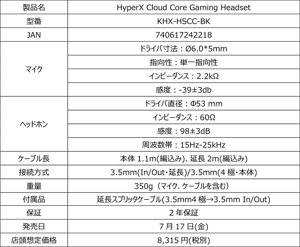Kingston製のゲーマー向けヘッドセット「HyperX Cloud Core」が国内発売。「HyperX Cloud」から付属品を省いた廉価モデル
