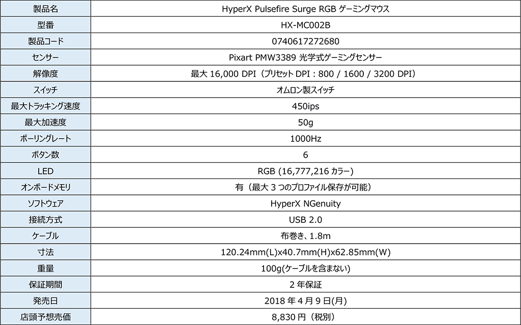 HyperXのゲーマー向けマウス「Pulsefire Surge RGB」が4月9日に国内発売。「Cloud Revolver」「Cloud Stinger」ヘッドセットのバリエーションモデルも