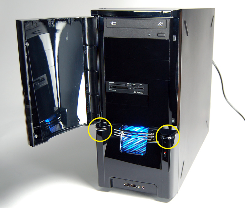 オープンタイプのドライブベイを覆う扉のすぐ下,前面パネルの両端に配された銀色のボタンは,向かって左側がLEDのカラー変更用(※右はATX電源スイッチ)になっており,押すごとに,「ブルー」「レッド」「シアン」「イエロー」「マゼンタ」の順で切り替わる。