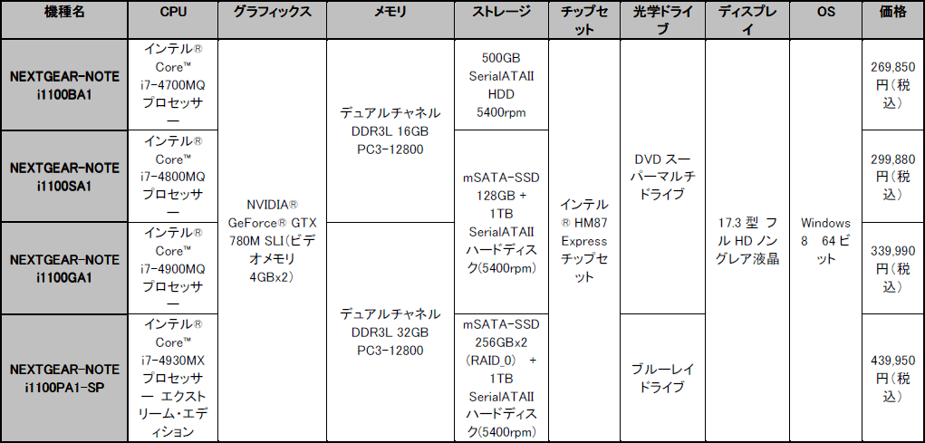 G-Tune,GTX 780M SLI+Haswell搭載のゲーム用ノートPCを発売