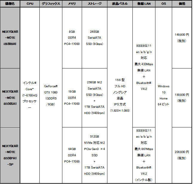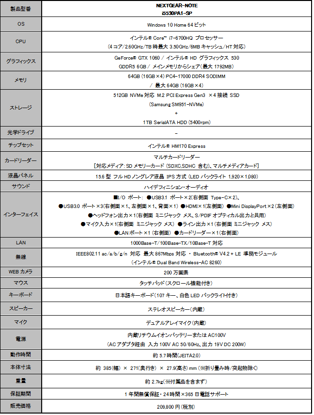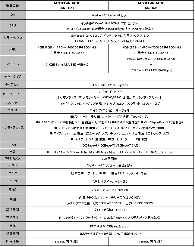 GeForce GTX 1060搭載でVR Ready準拠のゲームノートPCがG-Tuneから