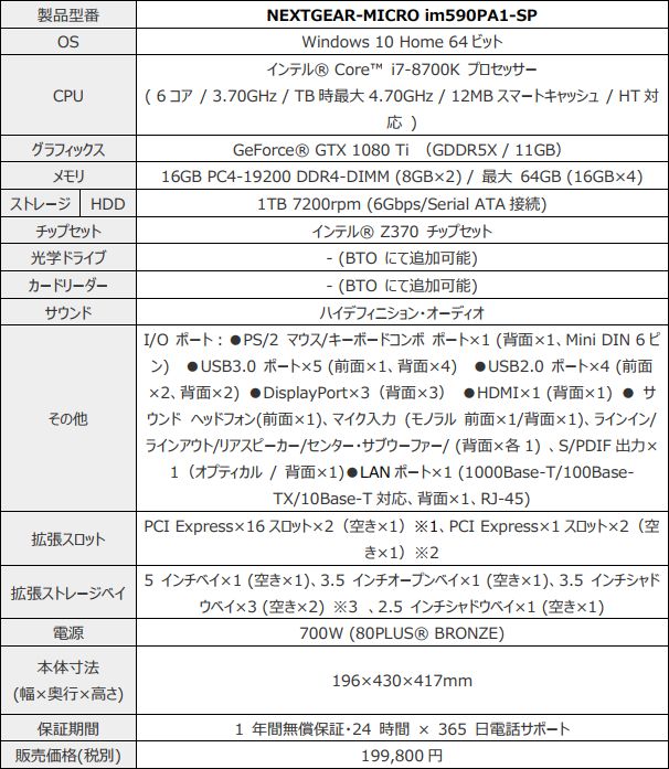 G-Tune,ミニタワー筐体にGTX 1080 Tiとi7-8700K搭載のゲームPCを発売