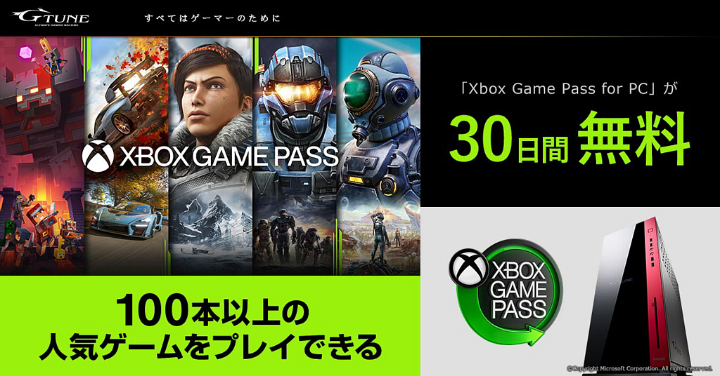 G-Tune,ゲームPCに「Xbox Game Pass for PC」の30日間試用版を同梱