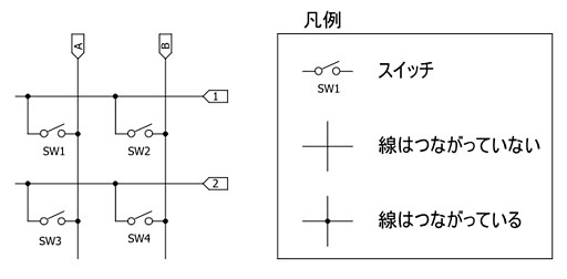 右の図がその例だが,たとえば「SW1」「SW2」「SW4」が同時に押下された状態で「A」のラインに電圧をかけたときには,波線のような感じで電流が流れることとなる。「SW2」がオンになっているため,「B」のラインにも電流が乗って,結果,「1」「2」がいずれもオンになってしまう。