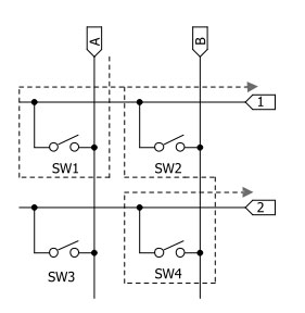 キーマトリックスにおいては,「A」→「B」→「A」……の順で電圧をかけていき,「1」「2」に現れる電圧でキースイッチのオン/オフを判断する。たとえば,ユーザーが「SW1」の上にあるキーを押下したとき,「A」のラインに電圧がかかって「1」に電圧が現れるが,キーボードのCPUからは,「『A』に電圧をかけたとき『1』に電圧が現れたので,『SW1』が押されている」と判断できる,というわけである。