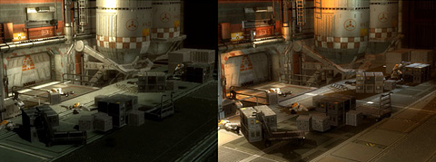 「Game Test 1」は宇宙海賊が襲ってくるお馴染みの「Return to Proxycon」。シーン構成こそ以前のものとほとんど変わらないが,テクスチャ解像度が上がっていたり,光源が増えていたり,あちこちでノーマルマップ(法線マップ)が使用されていたりと,グレードアップされた内容となっている。3DMark05時代から“HDRっぽい”(HDR:High Dynamic Range)処理は加えられていて,今回はそれがさらに派手めになってはいるものの,とくにHDR用のテストとは謳われていない。
