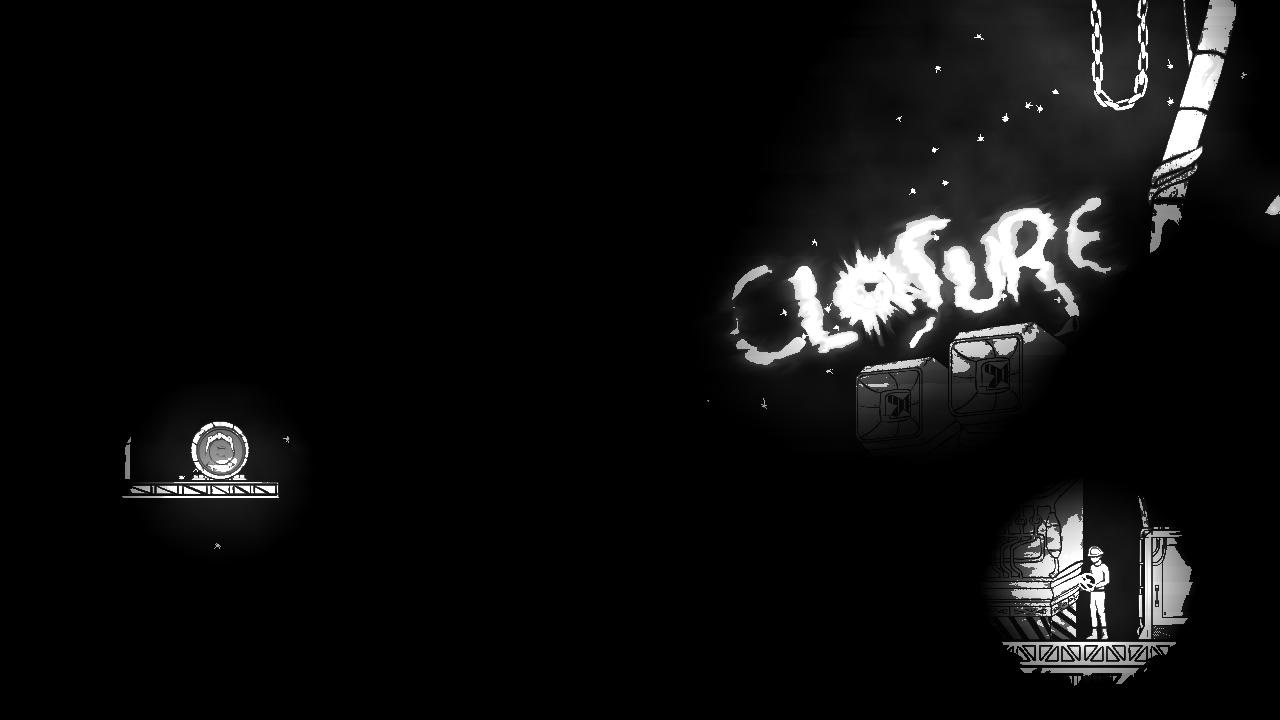 Closureは,黒と白だけで描かれた,独特の2Dサイドスクロール型アクションゲームだ。ラフスケッチがそのままゲームの画風になっているのがユニークで,何もしない状態では目の前のトラップが見えないほど真っ暗な中でゲームを進めていくという,タイトルの「閉鎖」が暗示するような,閉所恐怖症的な趣向になっている。