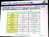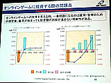 などを魅力的と話ながらも,初期に大きな設備投資が必要になる点や,サーバーなどの維持/管理といった固定費によって,サービスイン後も投資資金を回収できないリスクなどを指摘。ただ中古市場や海賊版に対しての不安要素が,パッケージゲームと比べて低い点なども合わせて指摘し,オンラインゲームは「投資の対象として十分に検討に値する商材だ」とし,講演を締めくくった。