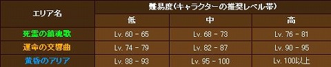 (各エリアの推奨レベル:死霊の鎮魂歌・Lv.60 運命の交響曲・Lv.74 黄昏のアリア・Lv88)