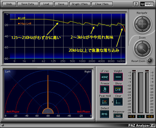 この「高域のなさと低域の薄さ」は,結果として音のスケールが一回り小さくなった,貧弱な印象を与えているが,実のところ一番気になるのは,(周波数特性計測では分からないのだが)低域のアタックが多少遅れて聞こえる点である。