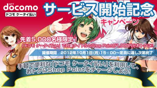 今回本サービスの開始を記念いたしまして、キャンペーン期間中に下記対象タイトルのいずれかで「ドコモ ケータイ払い」を利用し、『ドコモ ケータイ払いサービス開始記念Shop Point』を購入いただくと、先着で合計5,000名様に限り通常3,000円分のShop Pointが特別価格2,000円(税込)でチャージできるキャンペーンを開催いたします。