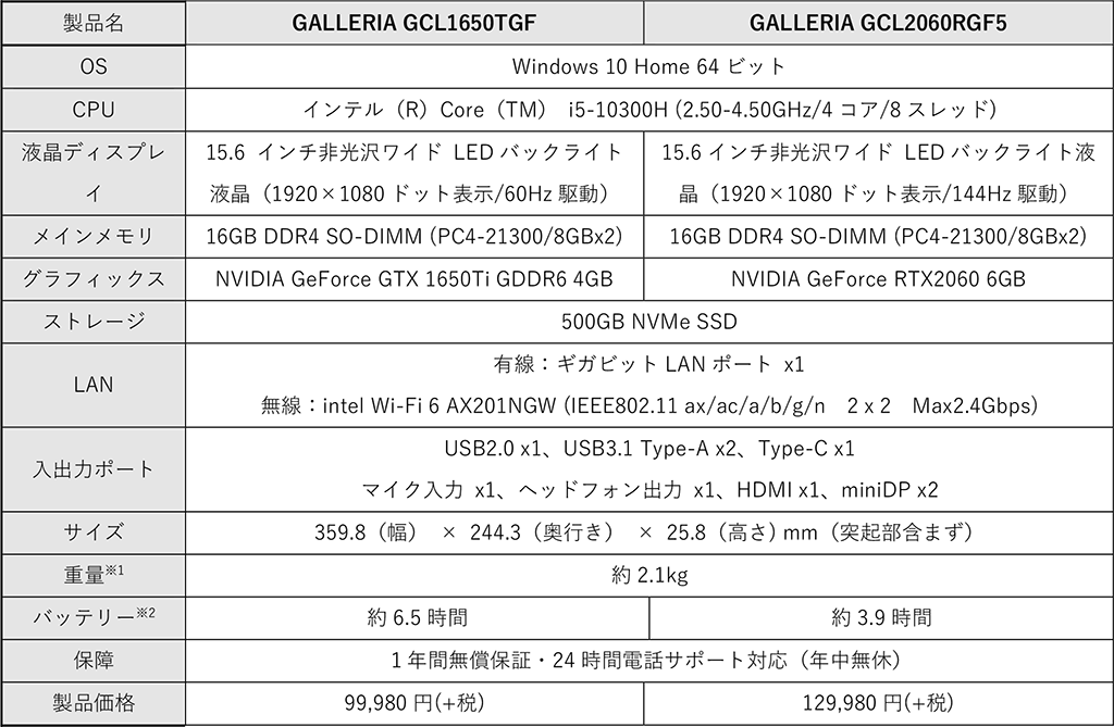 GALLERIA,第10世代Core i5搭載の15.6インチノートPC 2製品を発売