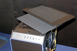 そこで,物を置いても塞がれないサイズの排気孔を確保しながら,埃の侵入を防ぐ取り外し可能なメッシュフィルターを使った3層の天板構造にして,物の置き場所と冷却を両立しています。排気孔は大きく取っていますので,140mmサイズのファンも搭載可能です。