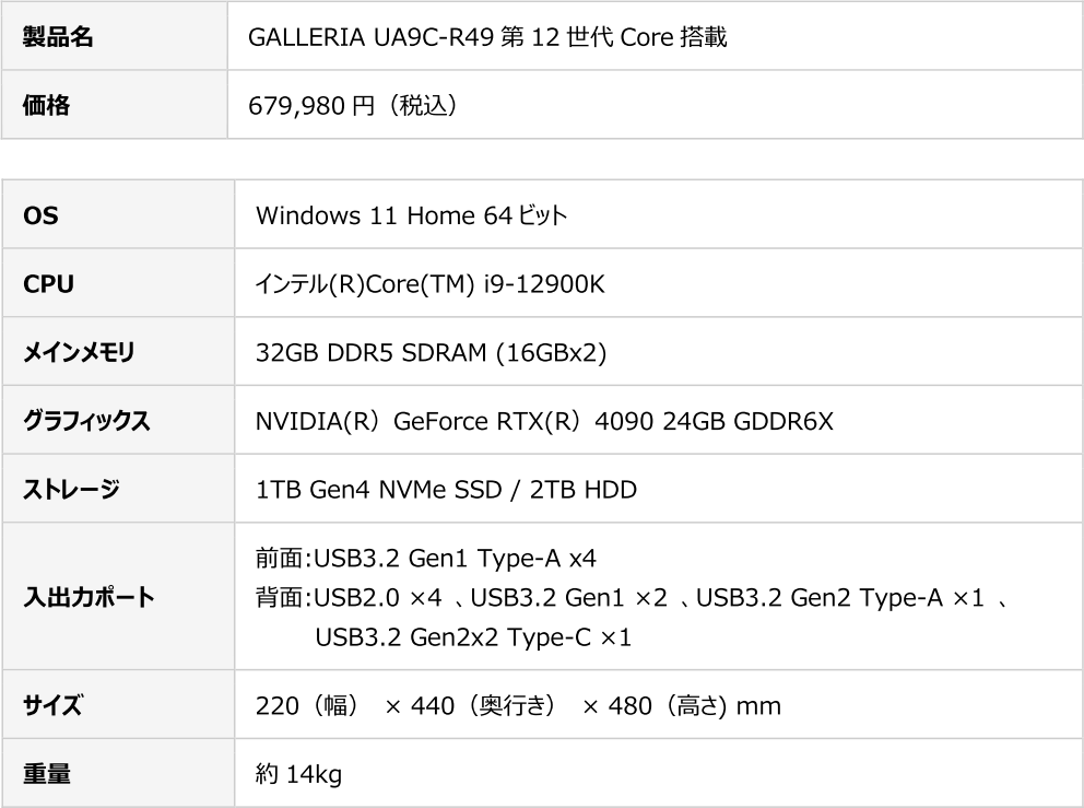 GALLERIA,RTX 4090&第12世代Core i9搭載のゲームPCを販売開始