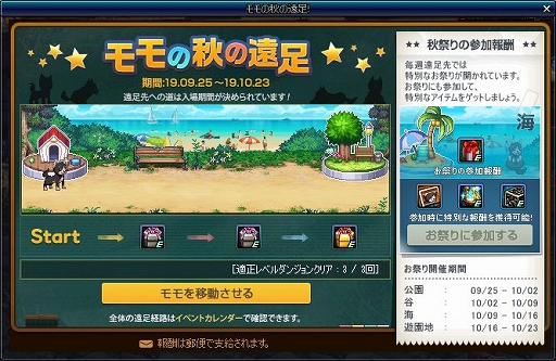 いつも彼らがエルブンガードの外へ旅立つ姿を見るだけだったモモの落ち込んだ後ろ姿…その姿を見たセリアはモモを可哀そうに思って「モモの秋の遠足」を実現してくれる冒険者を探している。エルブンガードの外ではあちこちで秋の遠足祭りが開催中されているみたい。モモと一緒に秋の遠足へ出掛けてモモを元気づけてあげよう!