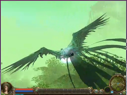 ![]() 飛行は,羽ばたいて空を自由に飛べる。ただし,飛行中は最長で1分間のゲージを消費していき,ゲージがゼロになると墜落してしまう。ゲージのリチャージには,飛行の約3倍の時間を要する。飛行時間を延長する薬品や,装備アイテムといったものもある |