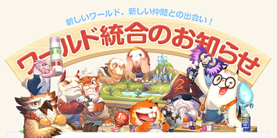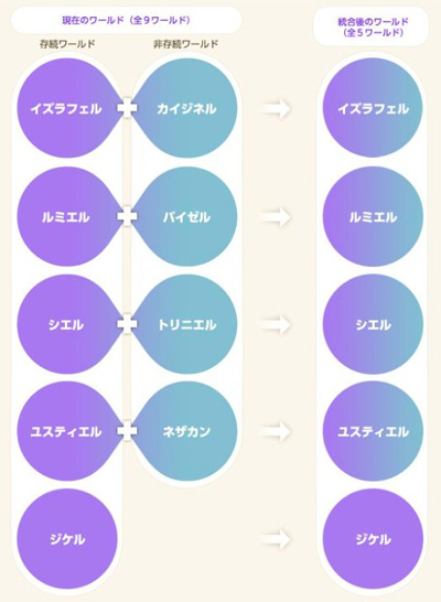 本作では,現在9ワールドのサーバーが稼動しているが,そのうち「ジケル」を除いた8ワールドを,ワールド名の残る存続ワールドとワールド名の残らない非存続ワールドに分け,全5ワールドに統合するとのこと。存続ワールドおよび非存続ワールドは以下のとおり。