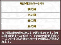 暁の陣は右記「春夏秋冬」のシーズンの前段階として設けられたものです。8月9日から9月5日の間に得た名声値で「暁の陣」の戦番付が発表されます。