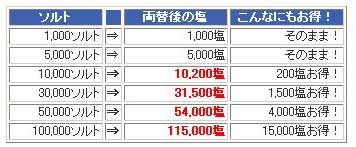 「天道オンライン」公式WEB サイト上、「天道ショッピングモール」も大幅に更新されました。課金アイテム購入用のポイント「塩」をソルトから両替する際、これまで、1,000 塩、5,000 塩、10,000 塩、50,000 塩の4種類のみとなっておりましたが、本日14 時より新たな両替単位として、30,000 塩及び100,000 塩の二種類が加わりました。