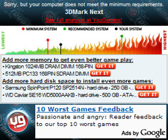 さて,先ほどの「CLICK HERE TO FIND OUT!」ボタンを押して十数秒ほど――Game-o-Meterでは「最長2分程度」とされている――待つと,Game-o-Meterの表示は左のようなものに切り替わるはずだ。これもだいたい見れば分かると思うが,中央より少し上のところにある炎のゲージにある緑のラインがいわゆる「必須環境」,黒いラインが手持ちのPCのスペックだ。さらに,「See full analysis at YouGamers!」のリンクをクリックすると,YouGamersへジャンプして,より細かな情報を見ることができるようになる。