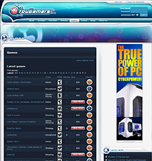 YouGamersにジャンプすると,「具体的に何が足りないのか」を(英文で)教えてくれる(左)。この画面は筆者の環境で試した結果だが,ページの下のほうに「GPUがGeForce 7800 GTで,OSがWindows XPなのが要件を満たしていない」とあるのが見て取れると思う。ちなみに右はYouGamersトップにある「Games」メニューを押したところ。チェック結果に基づいて,「ほかのゲームだとどうか」も確認できる