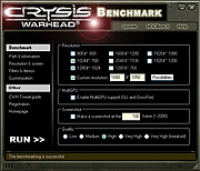 ここまで設定できれば,あとは簡単。Crysis Warhead Benchmarkのウインドウ左下に用意された[RUN>>]ボタンを押すだけだ。途中で解像度設定などを切り替える必要はなく,自動的にテストが進んでいく。