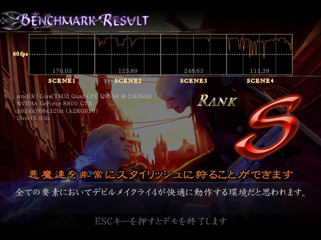 htmlファイルに出力されるスコアの傾向は,レギュレーション5世代におけるCrysisと変わらないので,指標も同じ。つまり,プレイアブルかどうかの基準は平均25fpsで,ストレスを感じなくなるのは平均40fpsを越えてから,ということになる。
