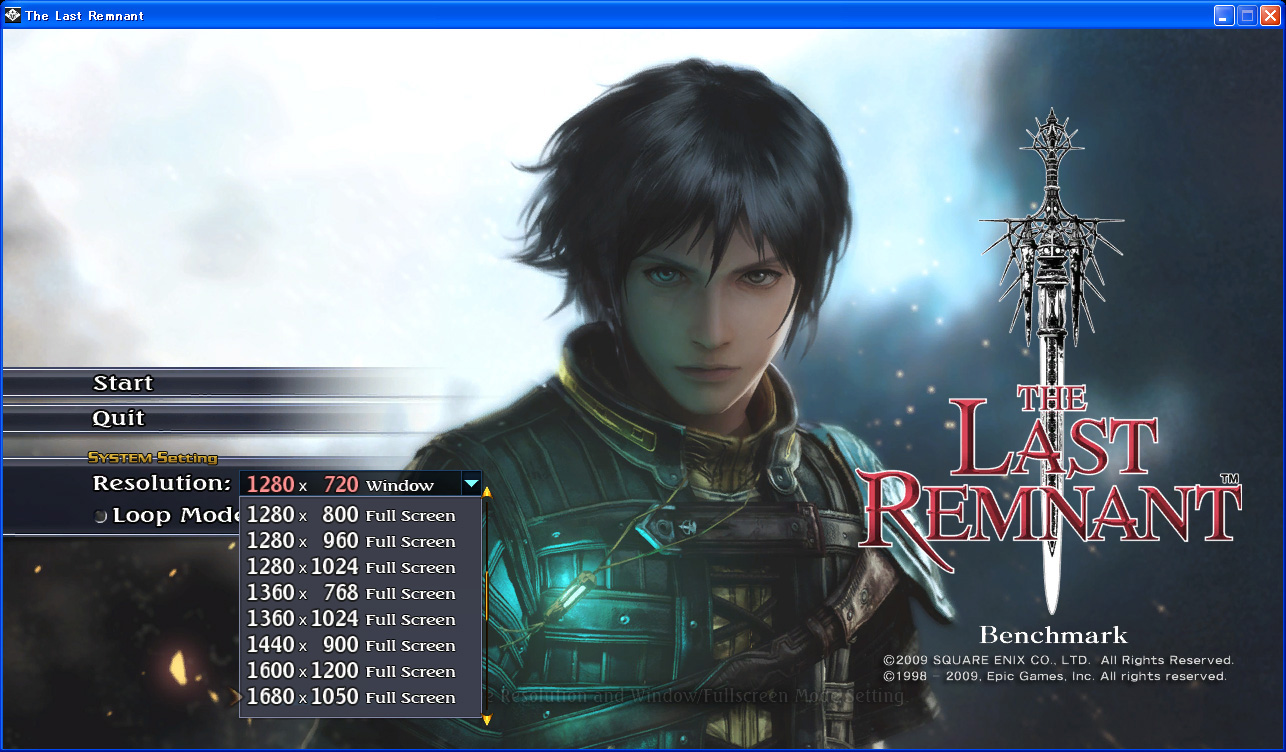 ベンチマークの実行に当たっては,ダウンロードした圧縮ファイルから解凍したフォルダ「The_Last_Remnant_Benchmark」の下,「Binaries」フォルダの「TLRBench.exe」を起動し,「Resolution」から解像度を設定するだけだ。